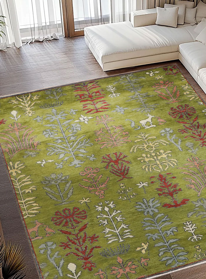 Lone Bloom Moss Garden Hand-Knotted Wool Rug